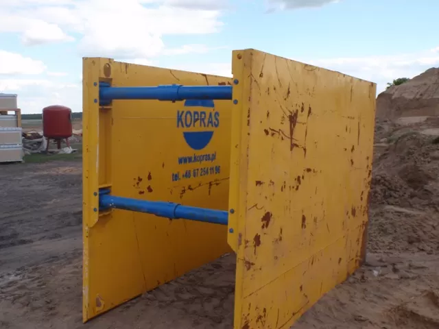 Stalowe ściany szczelne (boks) o wymiarach 3 000×2 000 ×60 mm, chroniące wykopy i ekipy robocze przed zsuwaniem się ziemi.